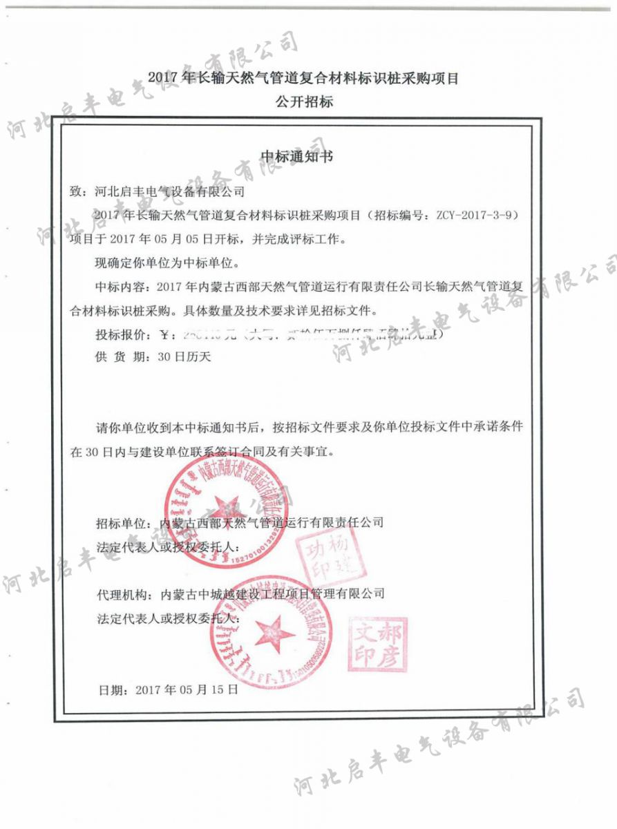 2017年5月,內蒙古西部天然氣股份有限公司針對《2017年長輸天然氣管道復合材料標識樁采購項目》進行公開掛網招標,我單位憑借優質的產品質量、先進的工藝水準和與西部天然氣的眾多名企長期的合作經驗,在本次競爭中盡顯鋒芒、脫穎而出!