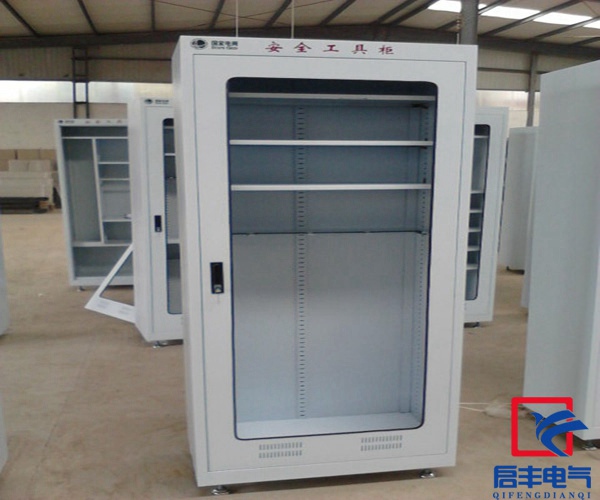 ?。?)柜體表面為靜電腐噴塑工藝,顏色為灰白色,柜門裝有通體加強鋼化玻璃,透過玻璃門可以看到分類有序的各種工器具。